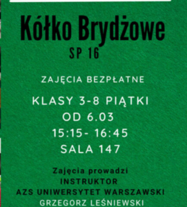 Szanowni Państwo,Sekcja brydża AZS Uniwersytet Warszawski serdecznie zaprasza uczniów SP 16 na…